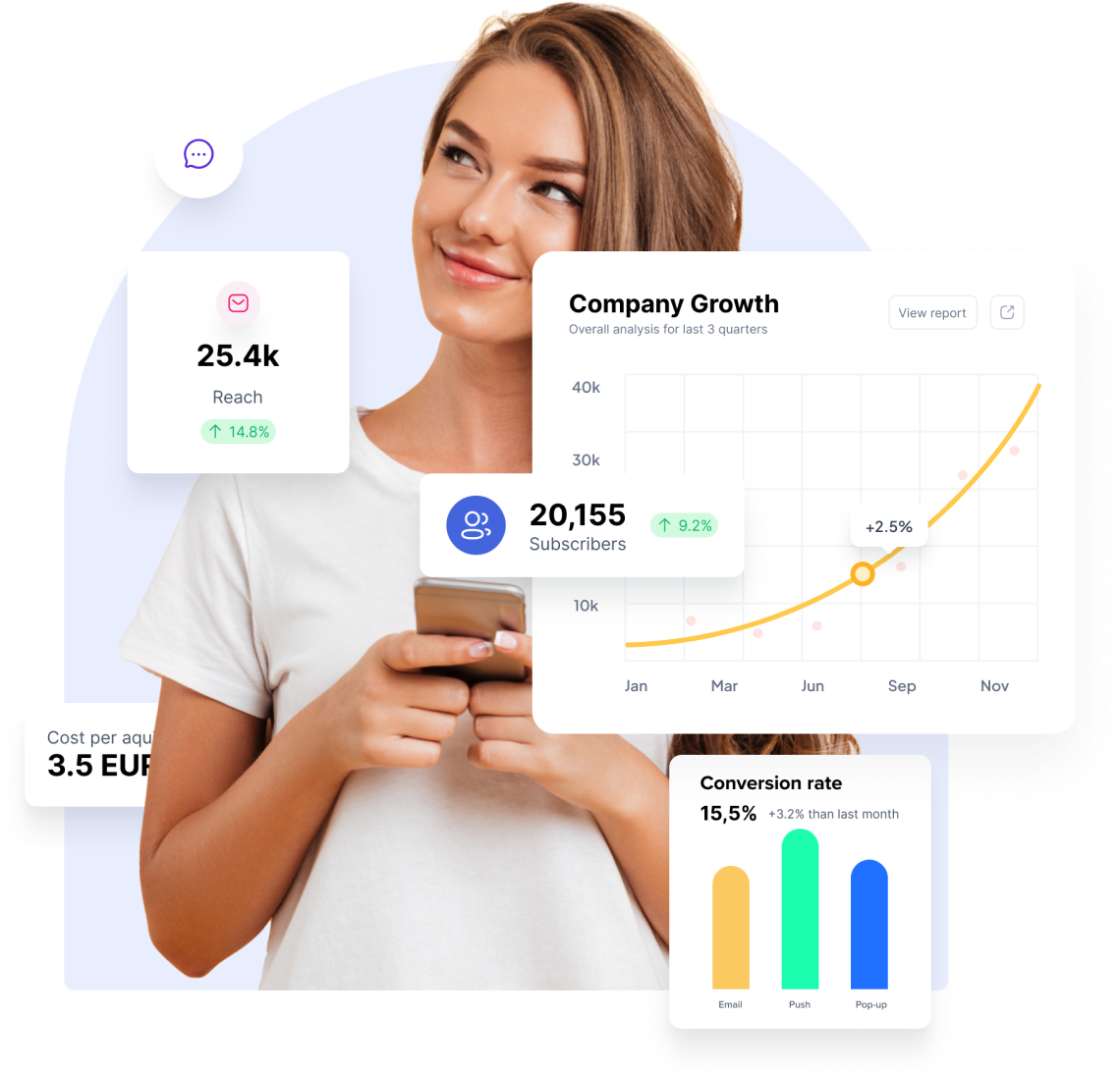 Send emails, push notifications and SMS with up to 15% Conversion Rate with the help oh AI-based product recommendations. Reach your customers across all available channels. 100% fully automated!